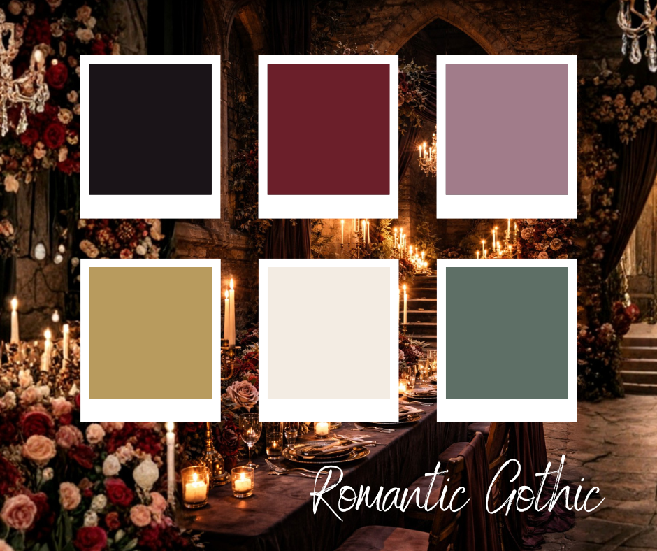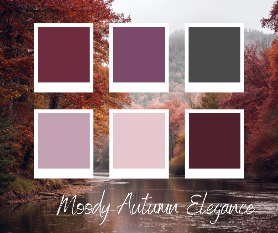 Deep, dramatic hues paired with muted neutrals create a look that feels intimate and refined. Perfect for candlelit ceremonies and evening receptions, this palette brings depth and sophistication to any fall celebration.